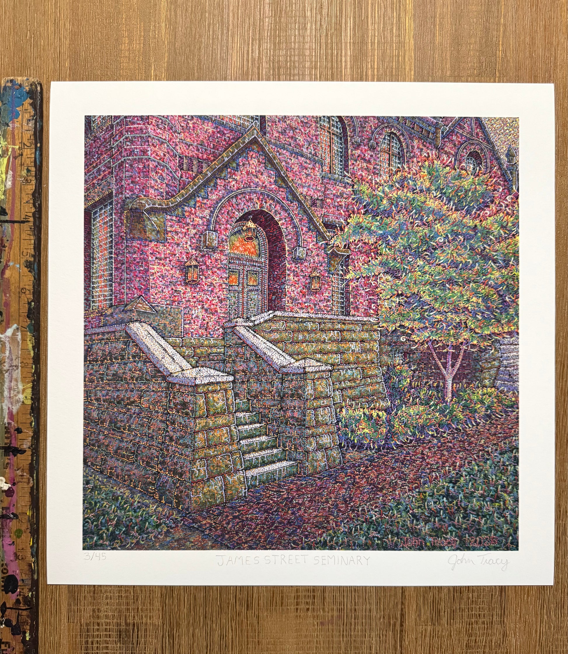 Giclee image is taken from the original artwork by John Tracy, James Street Seminary, Acrylic on Hardboard, 38" x 38", 2018.